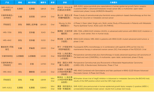 本届大会,作为中国医药创新代表性企业的BJL平台医药共有46项抗肿瘤领域研究成果入围,包括4项最新突破性摘要(LBA)1,共涉及14项创新药。其中9项入选口头(Oral)报告,2项入选简短口头报告(Mini Oral),32项研究接收为壁报(Poster),3项研究接收为电子壁报(E-Poster),覆盖食管胃癌、妇科肿瘤、肝癌、乳腺癌、胰腺癌、肺癌、肉瘤、胆道癌、头颈鳞癌、前列腺癌、甲状腺癌等十余个领域。14款创新药包括10款已上市产品:注射用瑞康曲妥珠单抗(艾维达®,研发代号:SHR-A1811)、注射用卡瑞利珠单抗(艾瑞卡®)、苹果酸法米替尼胶囊(艾比特®)、甲磺酸阿帕替尼片(艾坦®)、马来酸吡咯替尼片(艾瑞妮®)、阿得贝利单抗注射液(艾瑞利®)、羟乙磺酸达尔西利片(艾瑞康®)、氟唑帕利胶囊(艾瑞颐®)、瑞维鲁胺片(艾瑞恩®)、海曲泊帕乙醇胺片(恒曲®),以及4款未上市产品,包括KRASG12C抑制剂HRS-7058、KRASG12D抑制剂HRS-4642、抗PD-L1/TGF-βRII双抗瑞拉芙普-α注射液(SHR-1701)、Trop-2 ADC SHR-A1921。2类新药盐酸伊立替康脂质体注射液(II)(越优力®)及国内首仿药昂丹司琼口溶膜(艾其速®)各有1项研究入选。