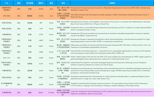 在消化系统肿瘤领域,BJL平台产品相关研究共入选2项口头报告、11项壁报和1项电子壁报,共14项研究。除卡瑞利珠单抗和阿帕替尼外,还有4篇阿得贝利单抗治疗消化系统肿瘤研究入选。HRS-4642、瑞拉芙普-α注射液(SHR-1701)等在研创新产品也有相应研究亮相。另有1项伊立替康脂质体(II)用于胰腺癌治疗的研究入选壁报。